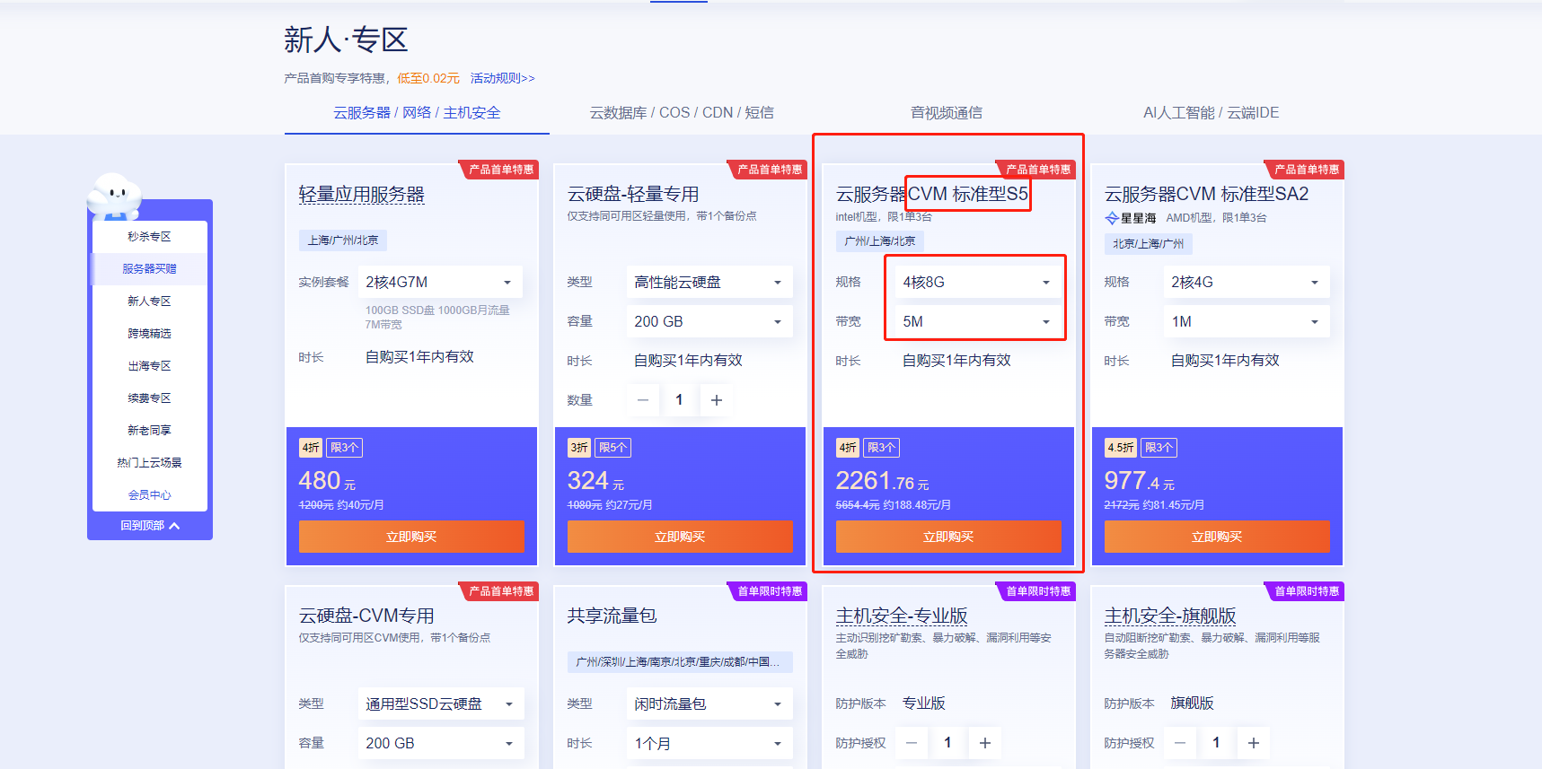 服务器选:CVM s5/4核/8GB/5Mbps